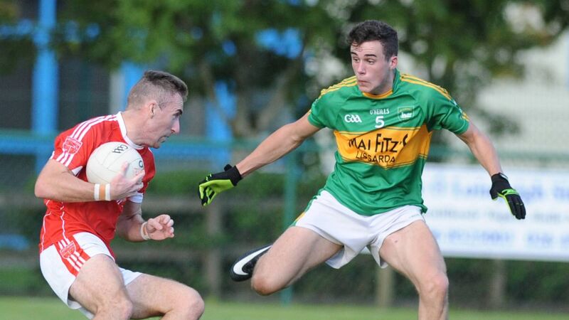 Iveleary's Brian Cronin takes on the challenge of John O'Mullane (Kilmurry) in the Mid Cork JAFC Final. Picture: John Tarrant