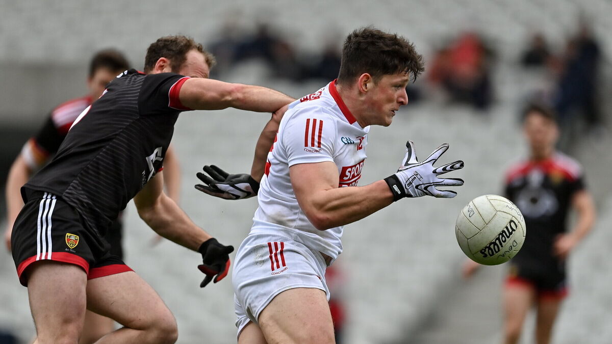 Colm O'Callaghan of Cork is tackled by Darren O'Hagan of Down at Páirc Uí Chaoimh on Sunday. Picture: Brendan Moran/Sportsfile