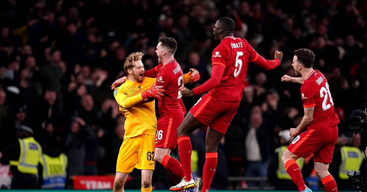 JUMPING FOR JOY: Liverpool's Caoimhin Kelleher celebrates with teammates after winning the Carabao Cup final at Wembley