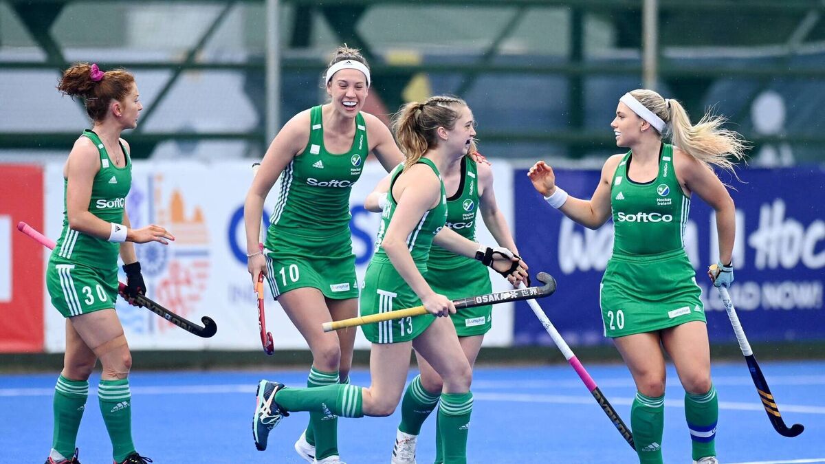 Caoimhe Perdue, on right, celebrates with team-mates after scoring Ireland's opening goal in the Women's Junior World Cup 2022.