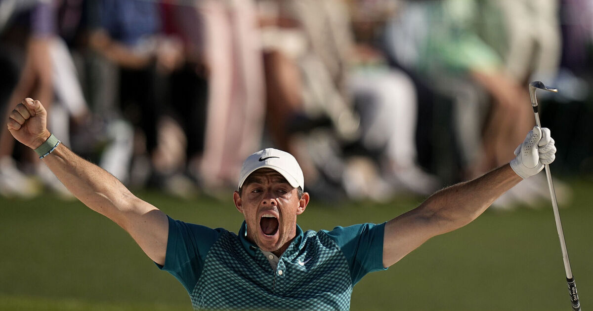 Rory McIlroy, of Northern Ireland, reacts after holing out from the bunker for a birdie during the final round at the Masters golf tournament on Sunday, April 10, 2022, in Augusta, Ga. (AP Photo/David J. Phillip)