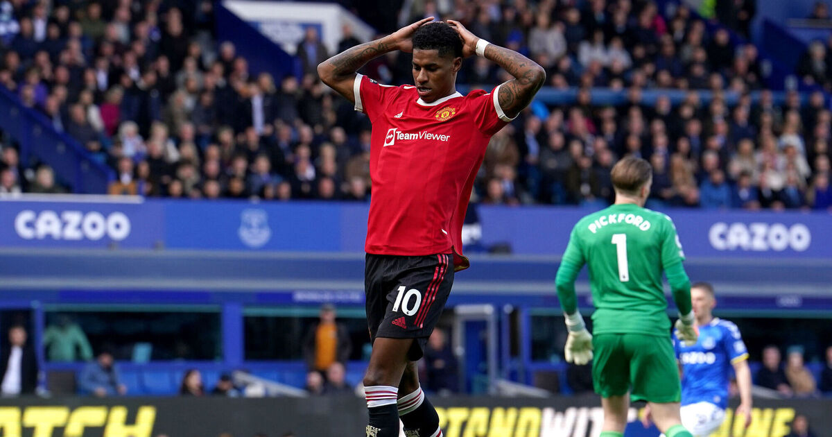 Manchester United's Marcus Rashford rues a missed chance against Everton at Goodison Park. Picture: Martin Rickett/PA Wire.