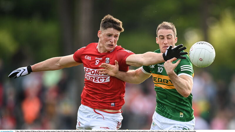 Stephen O'Brien of Kerry battles Colm O'Callaghan of Cork during the Munster semi-final. Picture: Stephen McCarthy/Sportsfile