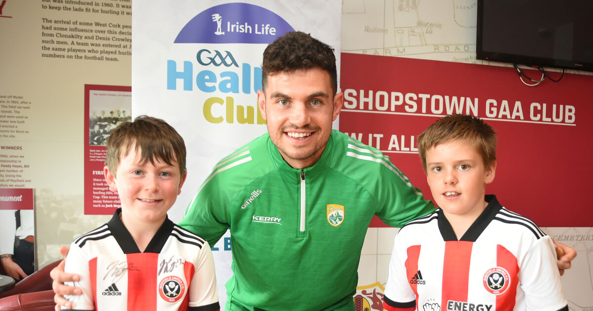 John Egan with Sheffield United fans Jack Crowley and Ross Forde at the launch of Bishopstown GAA Healthy Club Initiative. Picture: Larry Cummins