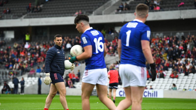 An injured Micheál Aodh Martin watches the Cork goalkeepers, Dylan Foley and Chris Kelly warm up before the win over Louth. Picture: Eóin Noonan/Sportsfile
