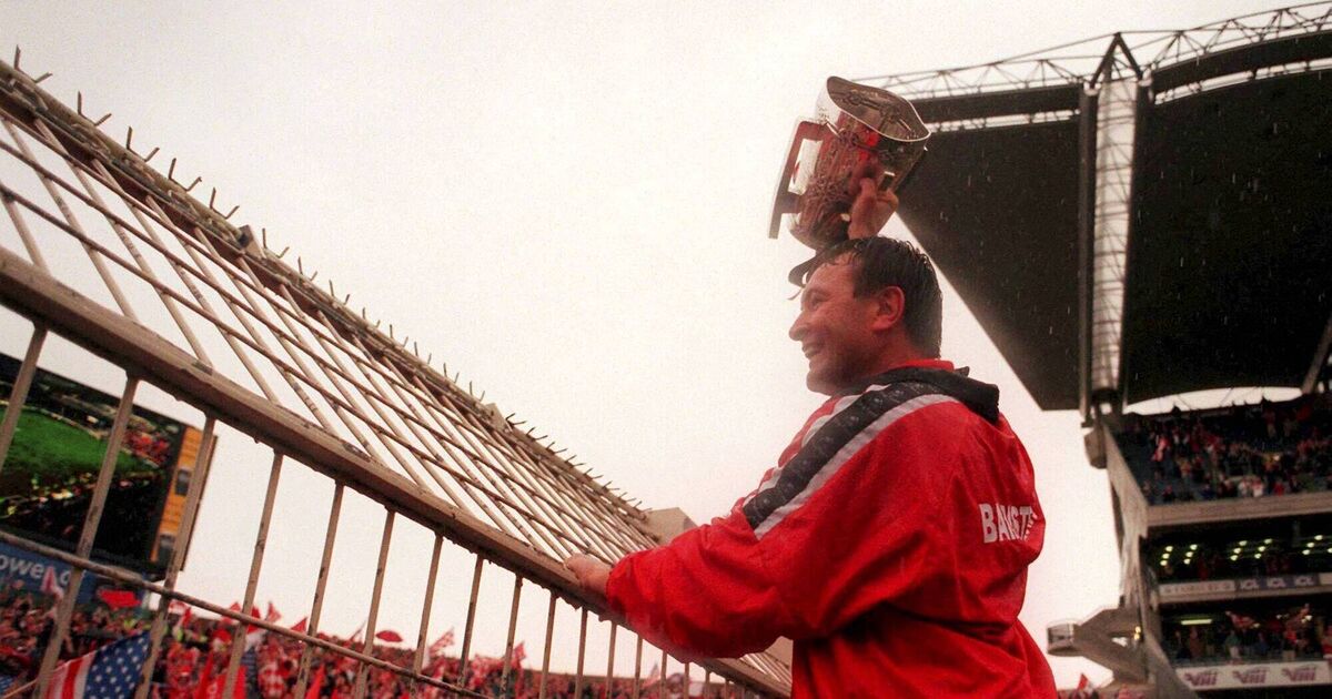 Cork manager Jimmy Barry-Murphy shows off the Liam MacCarthy Cup to Cork supporters on Hill 16 following the All-Ireland SHC final in 1999. Picture: David Maher/Sportsfile