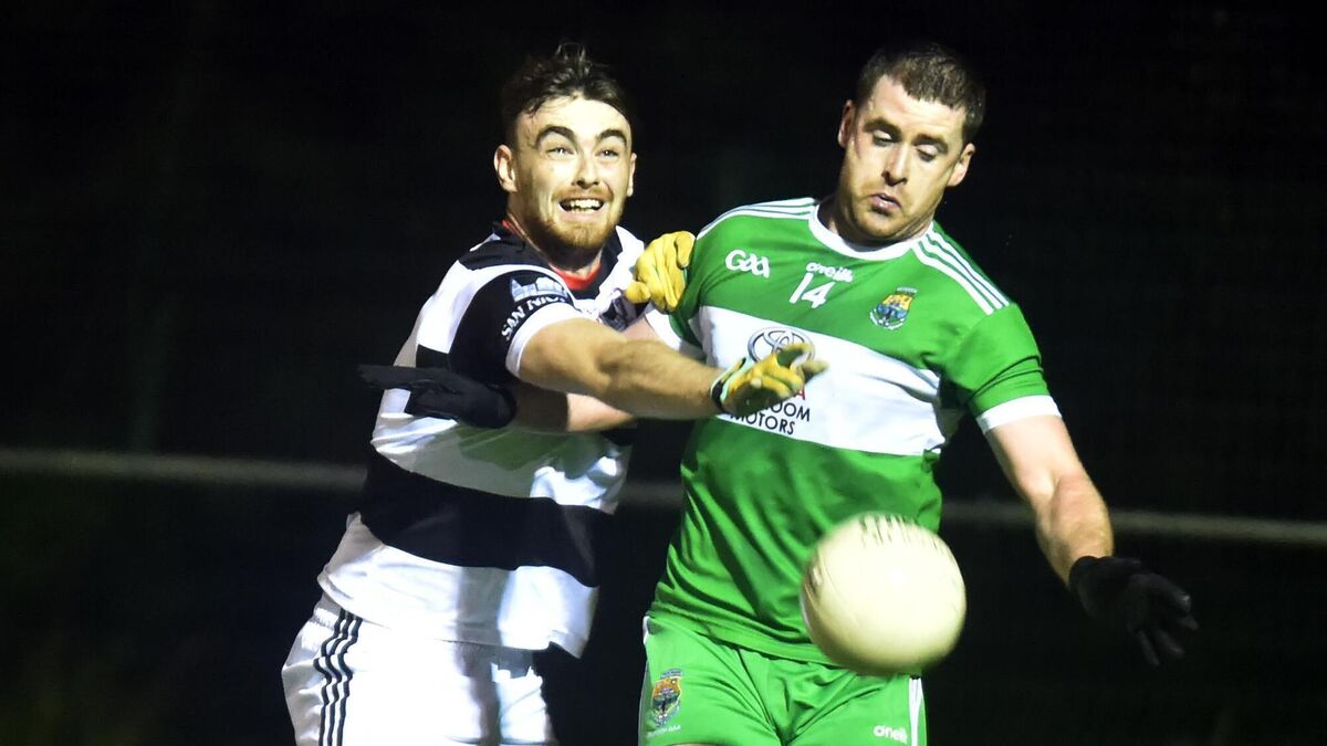 St Nick's Ruairí Byrne and Macroom's Fintan Goold tussle for the ball during the Bon Secours Cork PIFC at Ovens. Picture: Eddie O'Hare