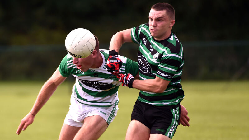 Douglas' Sean Powter wins the ball from Valley Rovers' William Hurley during the Bon Secours Cork SFC at Carrigaline. Picture: Eddie O'Hare