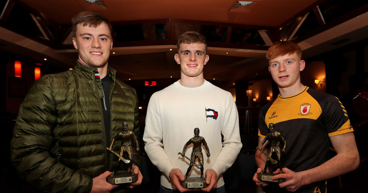 Kevin Moynihan, Daire Connery and Ross O'Sullivan, Na Piarsaigh players who represented Cork hurling, with trophies presented by the club. Picture: Jim Coughlan.