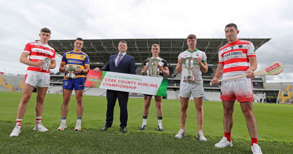 At the launch of the 2022 Co-Op Superstores Cork Club Hurling Championships were Liam O'Flaherty (third from left), Dairygold agri business general manager, with (from left) Tadhg O'Sullivan, Courcey Rovers; John Cronin, Lisgoold; Tommy O'Connell, Midleton; Darren Browne, Kanturk; and Fionn Herlihy, Ballygiblin. Picture: Jim Coughlan