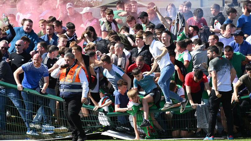 Cork City fans after a fence gave way during celebrations for Ruairí Keating's goal during the FAI Cup clash with at St Colman's Park. Picture: Eddie O'Hare