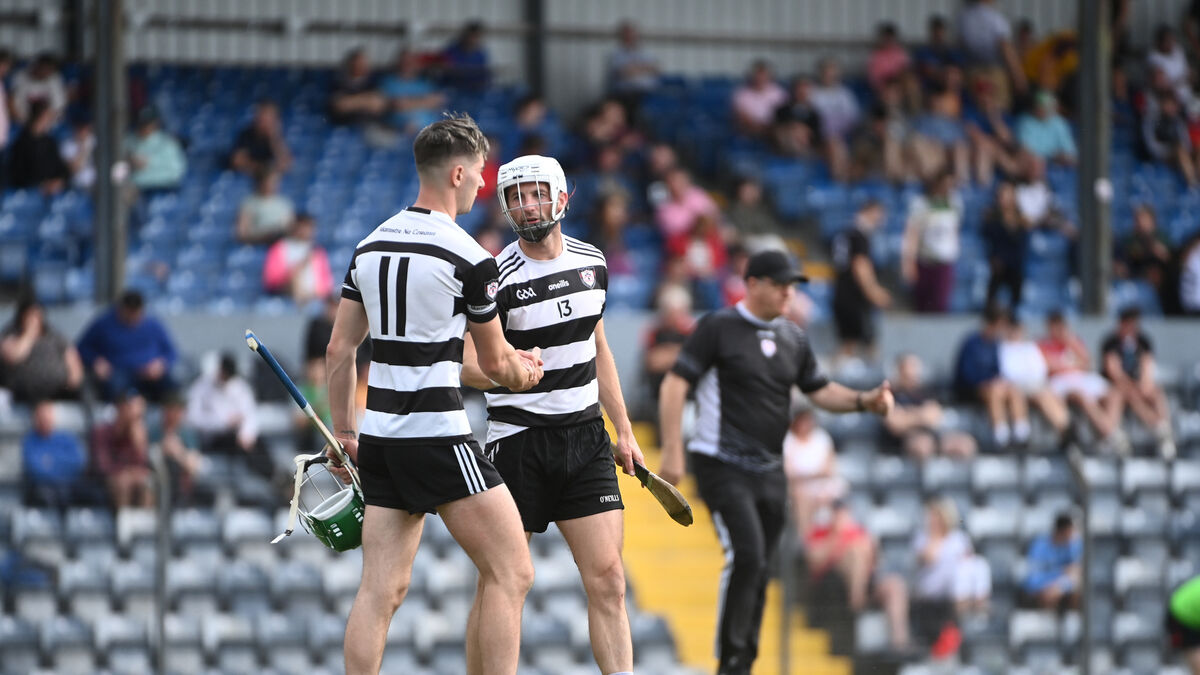 Midleton teammates Ross O'Regan and Luke O'Farrell shake hands after the win over Blackrock. Picture: Larry Cummins