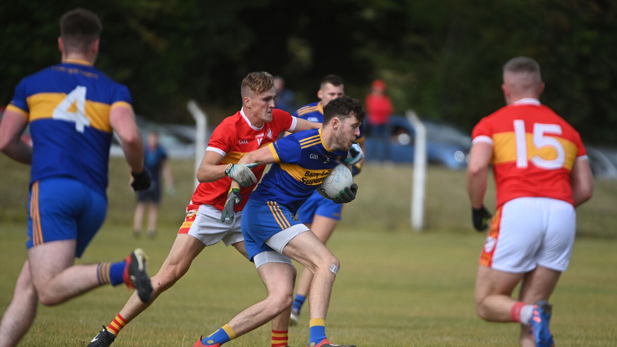 Kevin Kavanagh, Carrigaline holds possession under pressure from Joe Cooper, Éire Óg, in the Premier SFC game at Ballygarvan. Picture: Larry Cummins