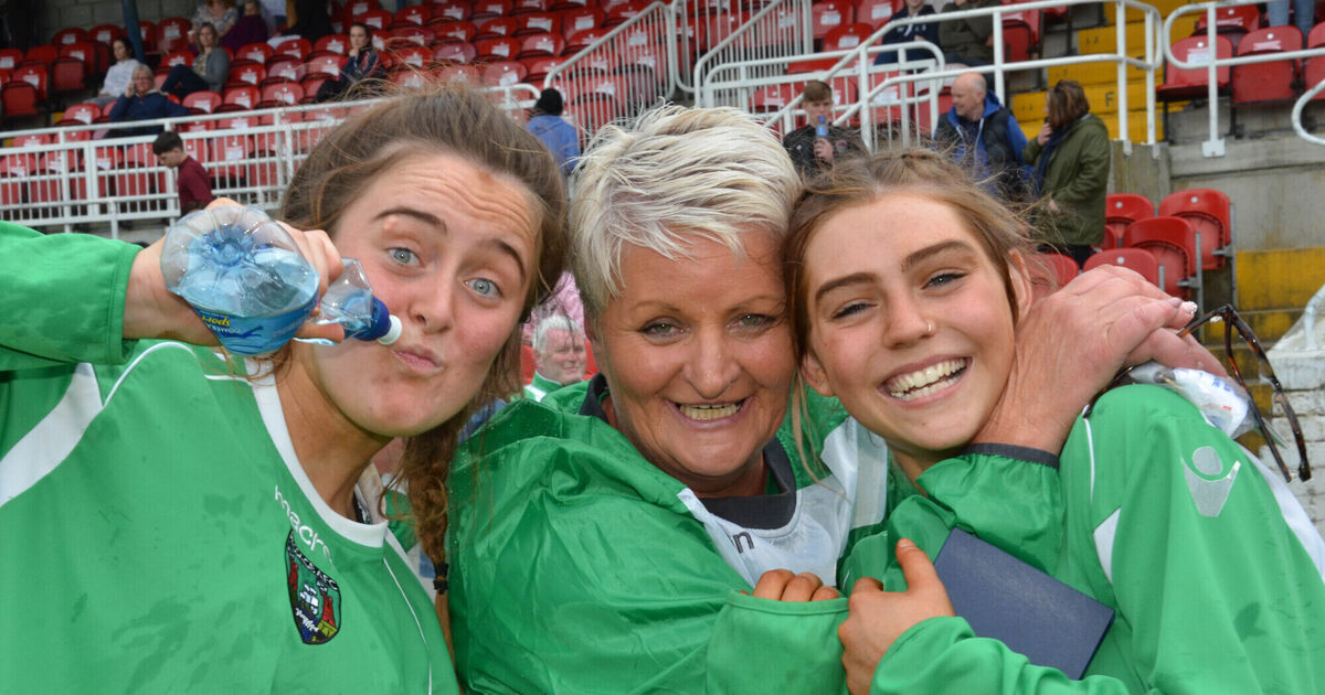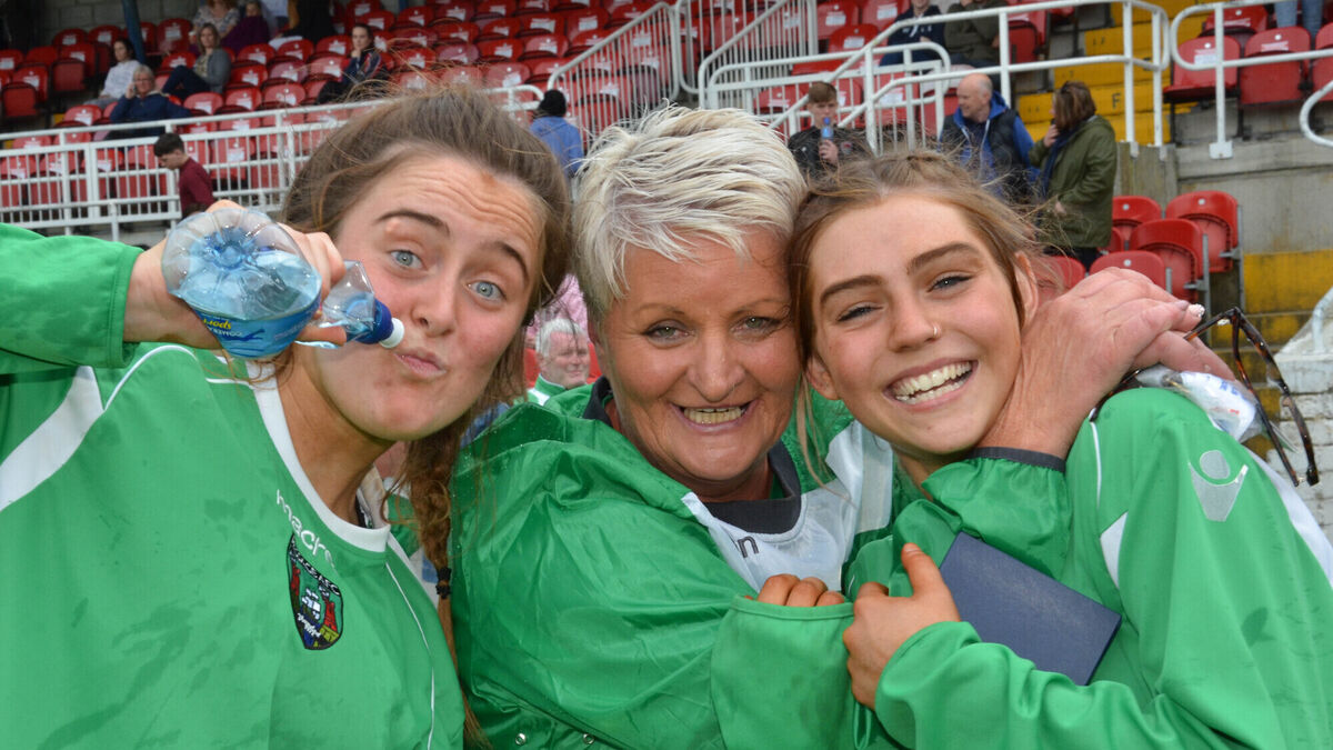 Coach Tina Murphy with Faye Aherne and Nicole Moriarty following their win over Riverstown in the CWSSSL U18 Shield Final at Turner's Cross in 2018. Picture: Howard Crowdy