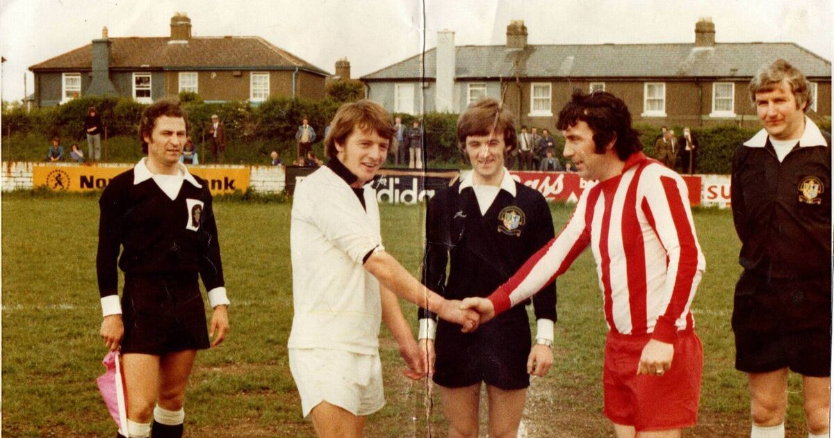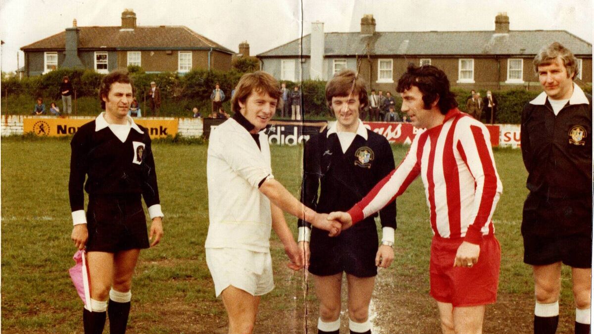 Before the 1976 AOH Cup final officials Edmund Fitzgerald, Pat Kelly and Finbarr O’Sullivan look on as Edward Healy (St Mary’s) and Christy Lynch (Castleview) shake hands.