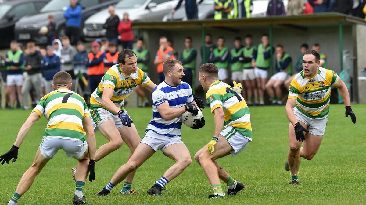 Michael Hurley, Castlehaven, surrounded by Carbery Rangers players Brian Shanahan, Alan Jennings, James O'Riordan and Thomas O'Rourke. Picture: Dan Linehan