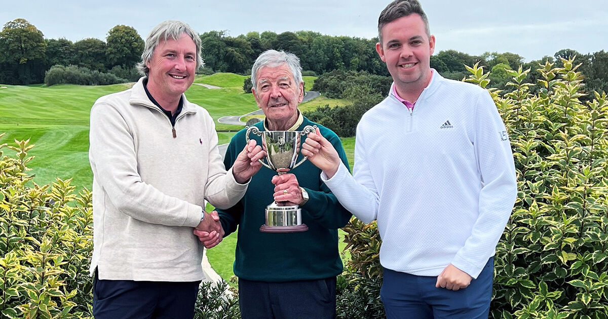 David Ryan (East Cork) and Shane Sullivan (Callaway Golf) receiving the Munster PGA Fourball Trophy from Ted Higgins at the first Winter Series event at Castlemartyr Links.