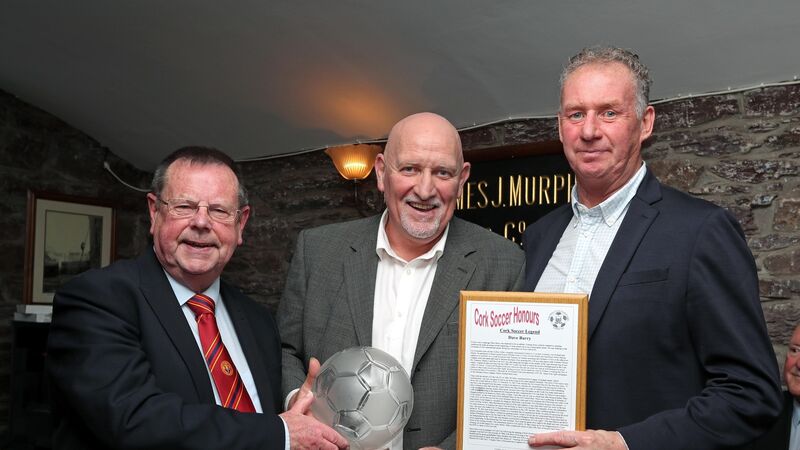 Soccer Legend Award, Tom Fitzgerald, Chairperson Cork AUL presents, Dave Barry, with his award, also included is Jim Cashman, Heineken Ireland. Picture: Jim Coughlan.