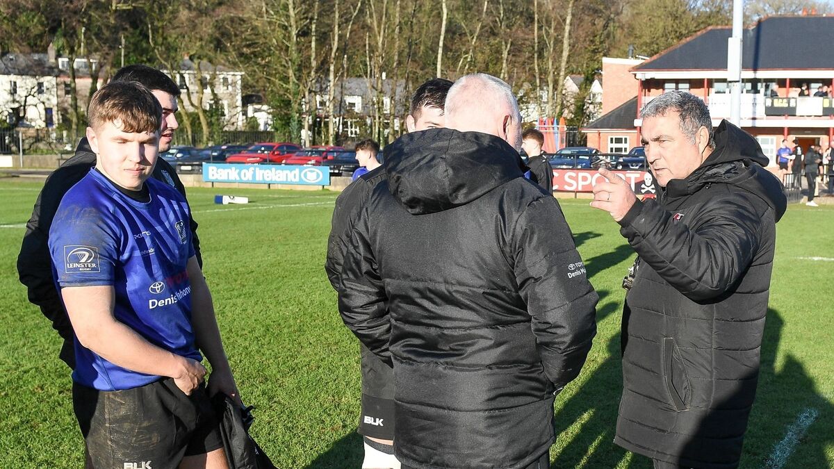 UCC Head Coach Michael Bradley speaking to Old Belvedere officials and players after hearing their match at the Mardyke had been postponed. Picture: David Keane.