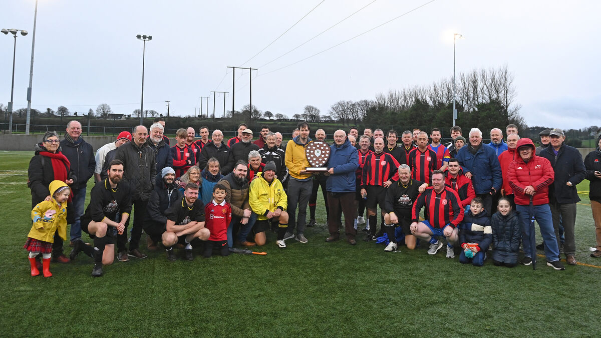 Tony Rodgers presents the trophy to Swan & Cygnet's Mick Moriarty, director of football after defeating The Outpost in the 50th annual Peter Rodgers memorial shield in aid of the Children's Leukaemia Fund (CUH) held at Corinthians Picture; Eddie O'Hare