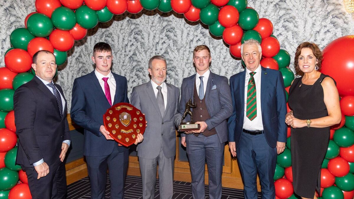 Young Player of the Year Paudie O'Sullivan and Adult Player of the Year Billy Dunne with Mark Sheehan, chairman Cork GAA, Séan Kelly, MEP, Dan O'Connor, chairman Fr O'Neill's, and Avril Geary, chair East Cork GAA, at the joint Fr O'Neill's victory dinner in Garryvoe Hotel. Picture: Denis O Flynn.