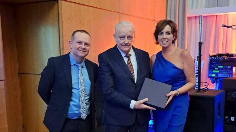 Mick Leahy receives the inaugural Castlemartyr GAA Lifetime Achievement Award from Avril Geary and Mike Falahee.