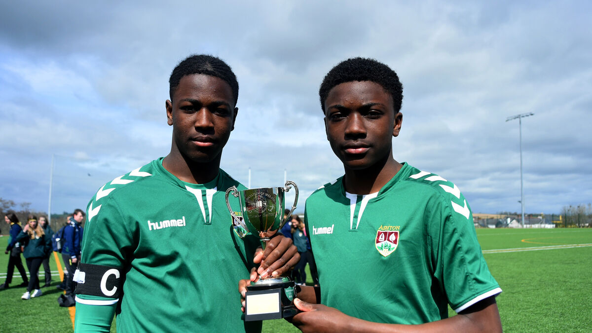 Aston School team captain Franco Umeh and his brother Jayden after they helped their side to the FAI Schools Munster U17 Junior Cup last season. Picture: Larry Cummins
