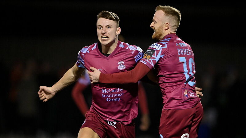 Tiernan O'Brien McAllister of Cobh Ramblers celebrates with teammate Jack Doherty after scoring at Mounthawk Park. Picture: Brendan Moran/Sportsfile