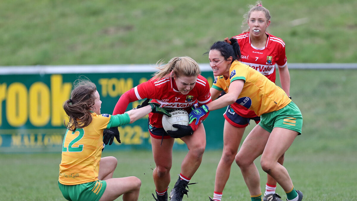 Libby Coppinger, Cork, takes on Katie Dowds and Shelly Twohig, Donegal. Picture: Jim Coughlan.