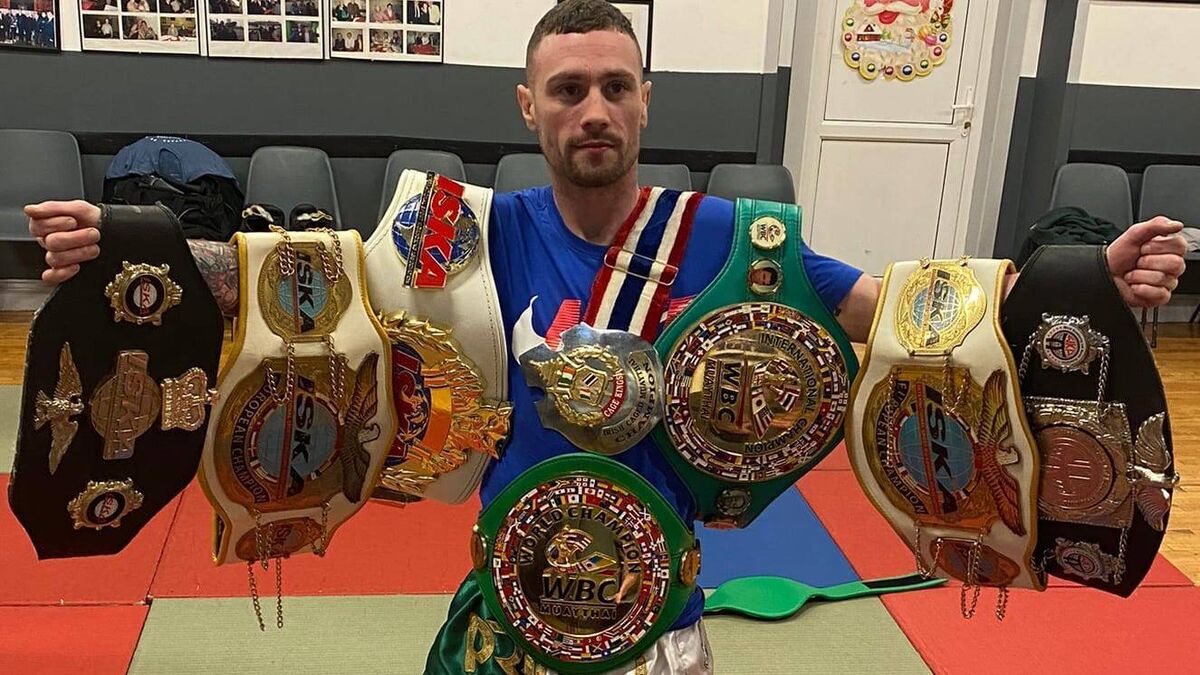 Ryan Sheehan with his WBC Muay Thai Bantamweight World title belts at the Siam Warriors gym in Blarney Street recently.