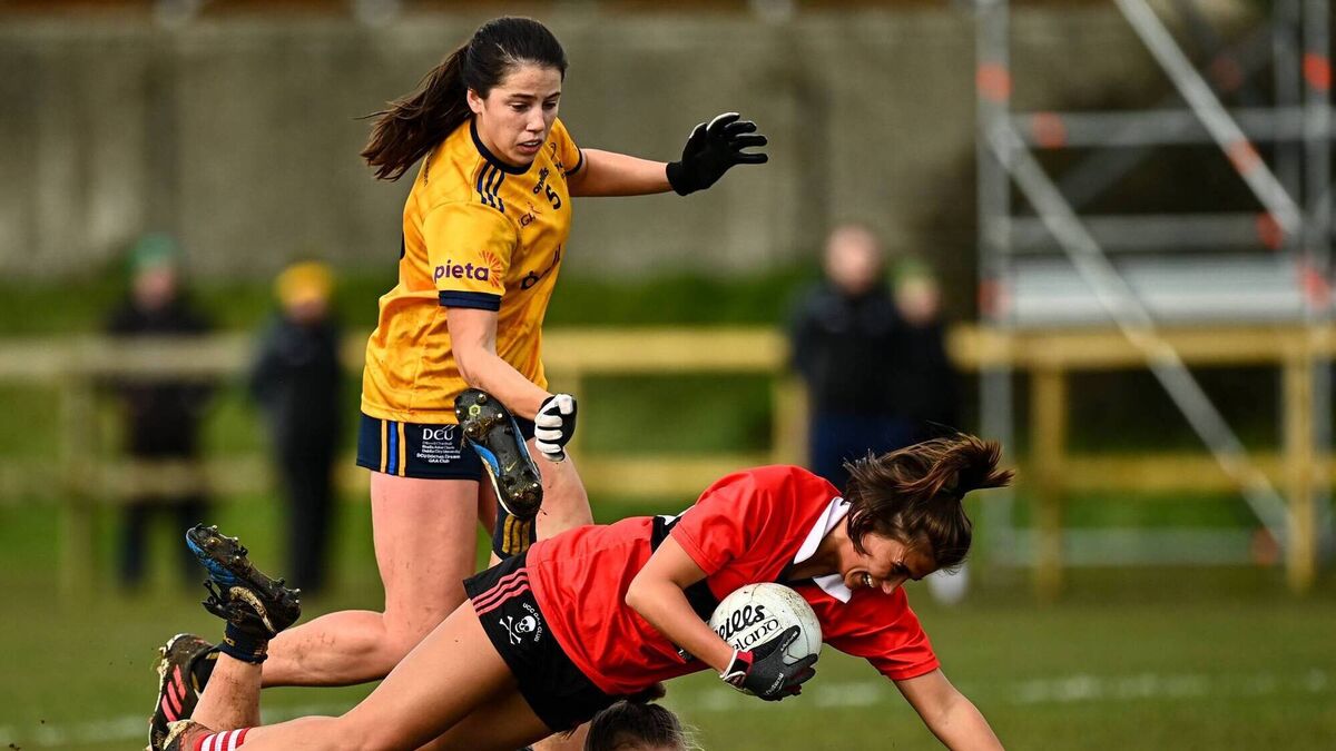 Ellie Jack of UCC is tackled by Jennifer Duffy of DCU Dóchas Éireann during the Yoplait LGFA O'Connor Cup semi-final last year. Picture: Eóin Noonan/Sportsfile