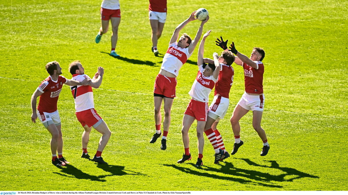 Brendan Rodgers of Derry wins a kick-out against Cork at Páirc Uí Chaoimh. Picture: Eóin Noonan/Sportsfile