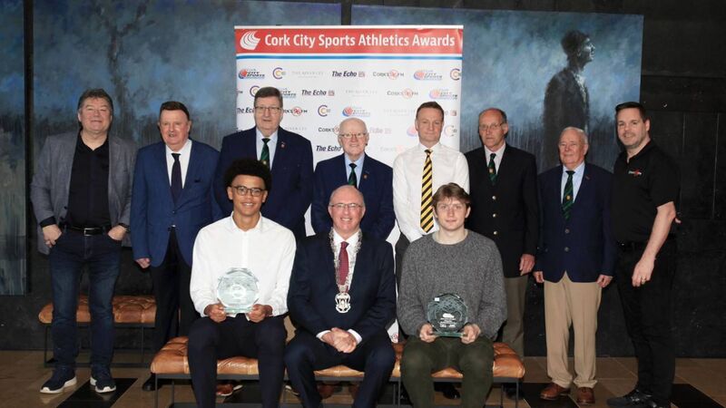 Cork City Sports Athlete of the Month recipients Ben O’Donovan (Cork Track Club) and Alex Ademola (Leevale AC) collecting their awards from the judges and sponsors. Picture: Tony O'Connell