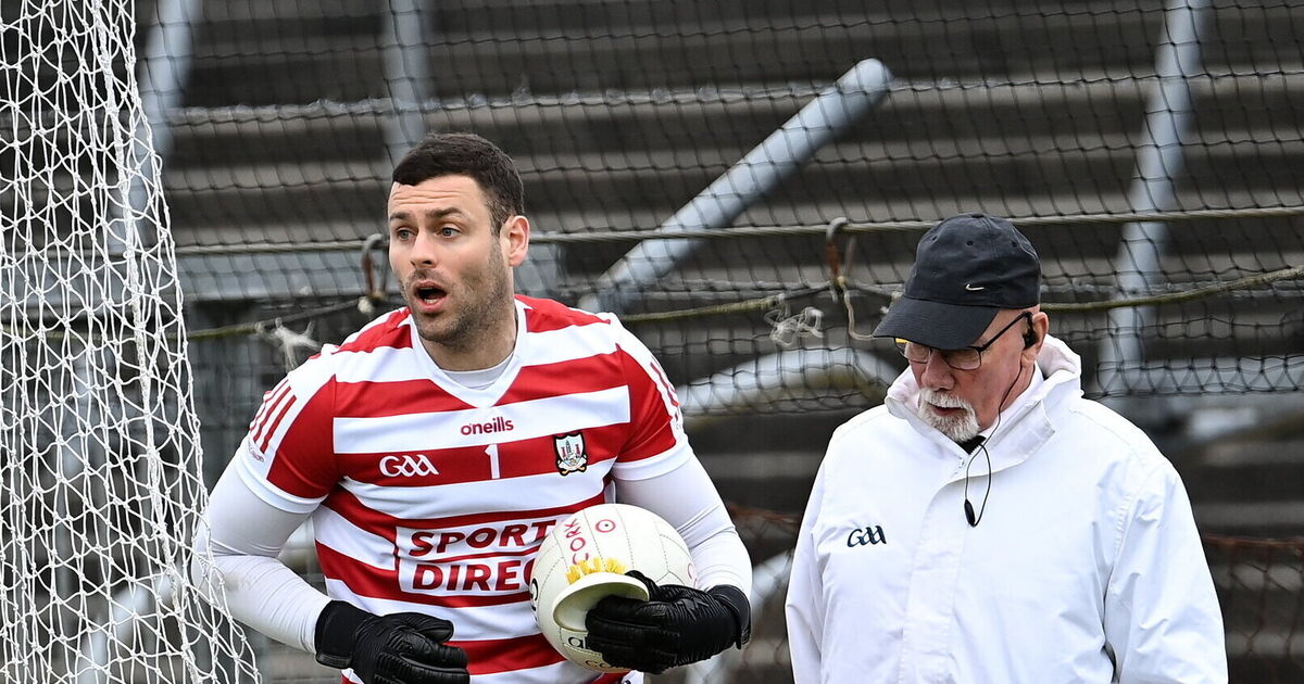 Umpire Paul Kelly watches Cork goalkeeper Míchéal Aodh Martin as he makes his way to take a quick kick-out. Picture: Piaras Ó Mídheach/Sportsfile