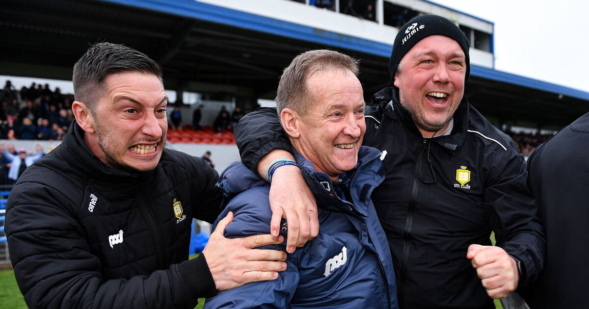 Clare manager Colm Collins celebrates with coaches Micheál Cahill and Joe Hayes after beating Cork. Picture: Piaras Ó Mídheach/Sportsfile