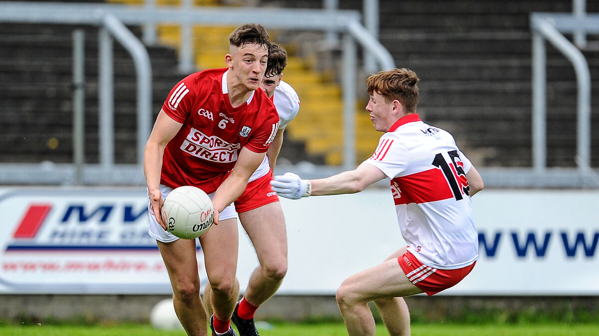 Cork’s Gearoid Daly faced by Eoin Higgins and Odhran Murphy of Derry in last season's All-Ireland minor quarter-final. INPHO/Tommy Grealy