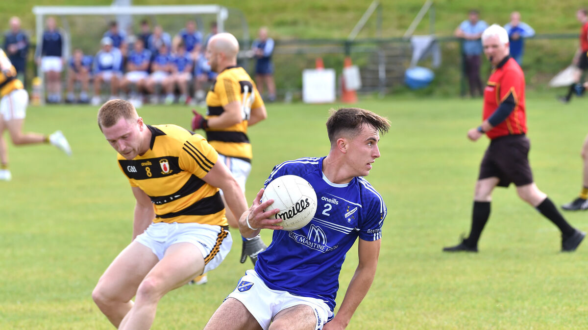 Seth Thornton, Bantry, getting away from Evan Sheehan, Na Piarsaigh, in the Bon Secours PIFC match at Dunmanway. Picture: Dan Linehan