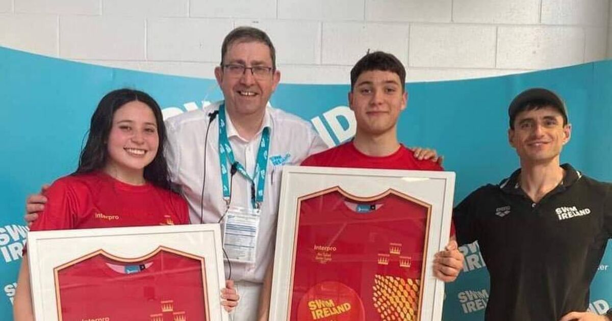 Munster Swimming made a presentation to the Interpro Captains, Hannah O'Shea and Marc Galland at the recent Long Course Championships in UL. Also in photo, Pat McTigue, Referee and Carlo Boni, Regional Pathway Coach. Photo: Munster Swimming No Repo Fee