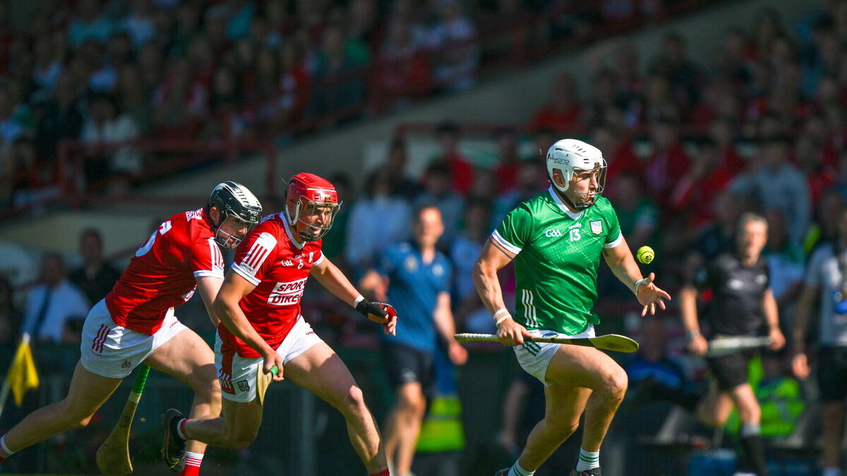 Aaron Gillane of Limerick races clear of Ciaran Joyce and Ger Mellerick of Cork last Sunday. Picture: Ray McManus/Sportsfile