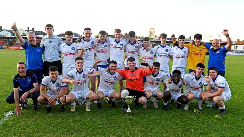 Blarney United players and mentors celebrate after defeating Carrigline United in the under 18 Murphy cup youth final at Turner's Cross. Picture; Eddie O'Hare