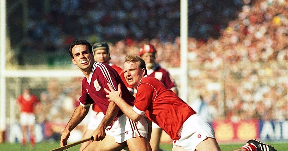 Cork's Teddy McCarthy in action against Anthony Cunningham of Galway in the 1990 All-Ireland hurling final.