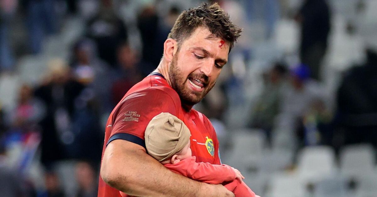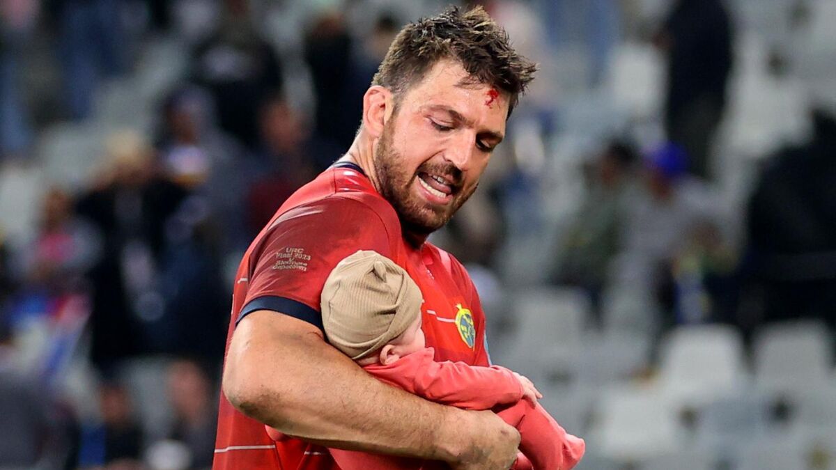 Munster’s Jean Kleyn and his son Eli after the URC victory. Picture: INPHO/James Crombie