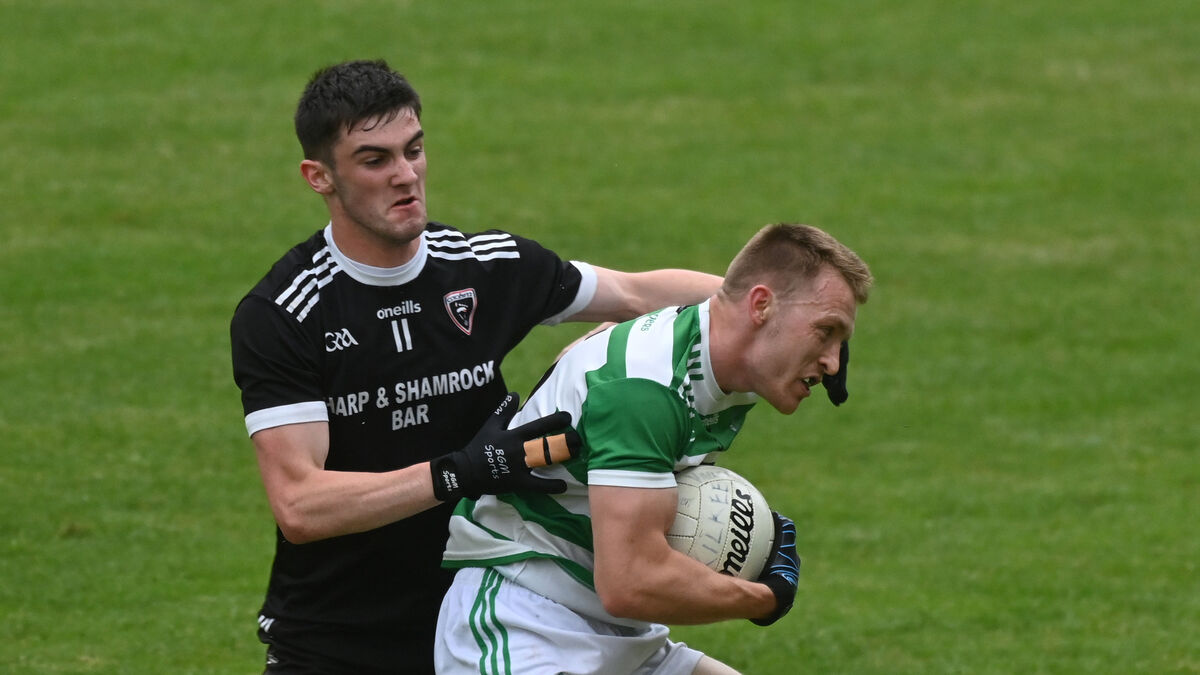 Valley Rover's Ben Murphy is tackled by Kiskeam's Tomas Casey during the Cork Credit Unions division 1 football league at Innishannon. Picture; Eddie O'Hare