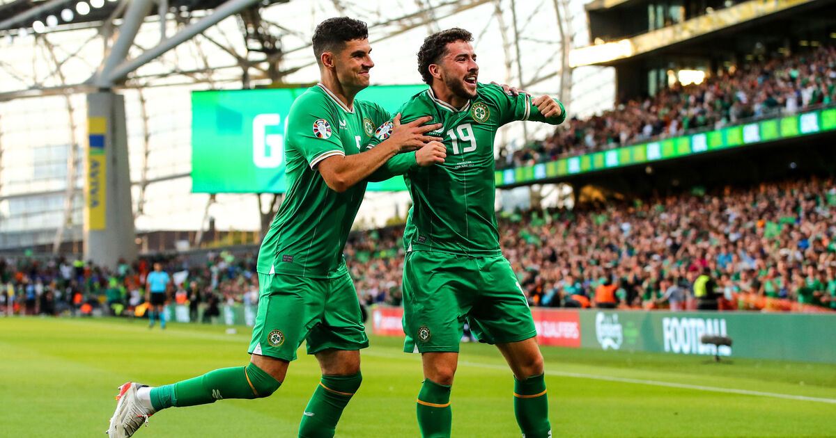 Ireland’s Mikey Johnston celebrates scoring their second goal with John Egan