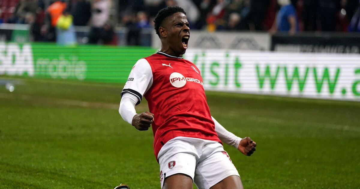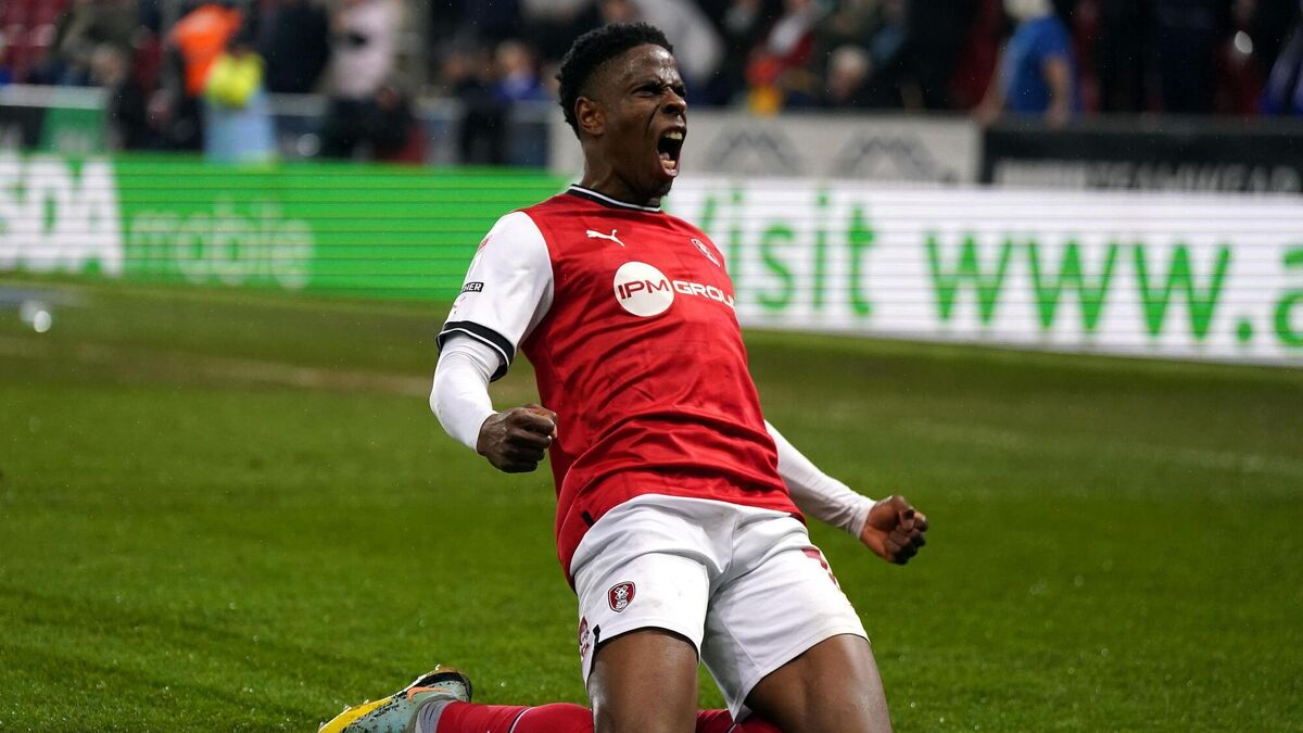 Rotherham United's Chiedozie Ogbene celebrates scoring their side's first goal of the game during the Sky Bet Championship match at the AESSEAL New York Stadium, Rotherham.