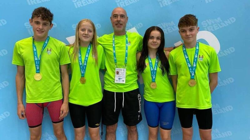 The SWSC Mixed Relay team claimed two National Titles at the recent Irish Natioanl Age Group Championships at University of Limerick. Victorious at 400m Freestyle & Medley relays. Liam O'Driscoll, Caoilinn O'Connor, Coach Frank Lynch, Aoife Gardiner and Thomas Bugler. Photo: Cliona O'Connor swimmers No Repo Fee.