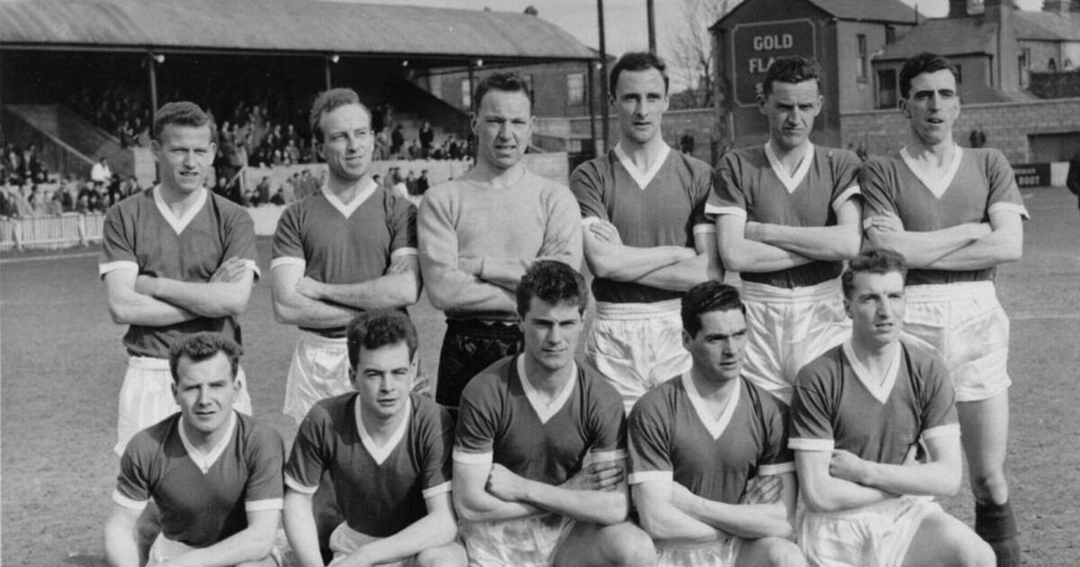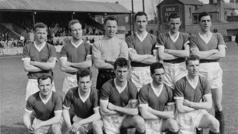 Cork Hibs 1958: Back: Jimmy Redmond, Johnny Vaughan, Sean O’Brien, Patsy Dorgan, Peter Doolan, Jack O’Connor. Front: Paul O’Donovan, Georgie Clifford, Jack Morley, Eddie Crossan, Liam O’Flynn.