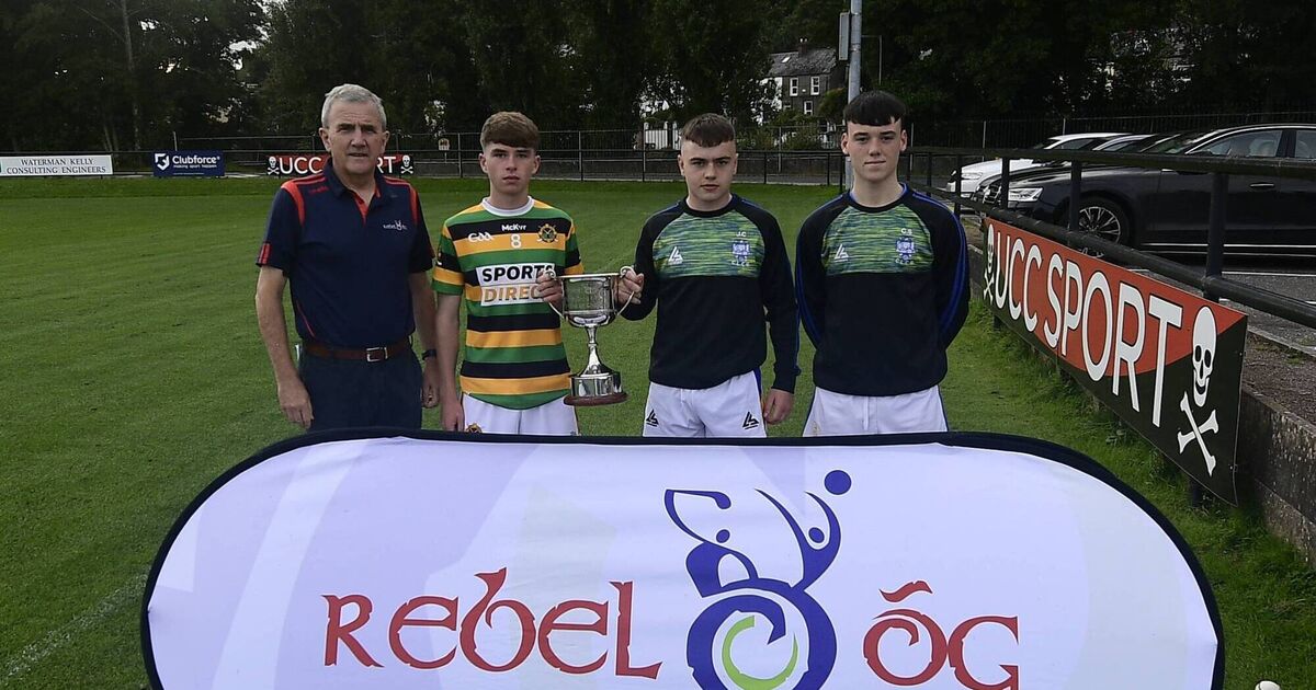 Michael O'Mahony, chairman of Rebel Óg; Evan McGuckian, Glen Rovers with Carrigtwohill's Jarlath Cullymore and Cathal Seymour, who contest the Rebel Óg U15 Premier 1 hurling championship final tonight at 8pm at the Mardyke. Picture: Steven Lynch