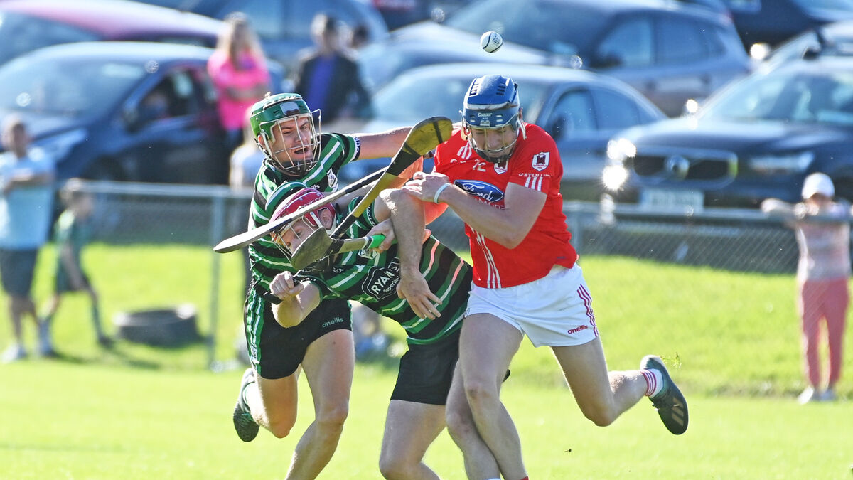 Charleville's Jack Doyle is tackled by Douglas's Stephen Moylan and Alan Cadogan during the Co-op SuperStores Cork Premier SHC game at Mourneabbey on Sunday. Picture: Eddie O'Hare