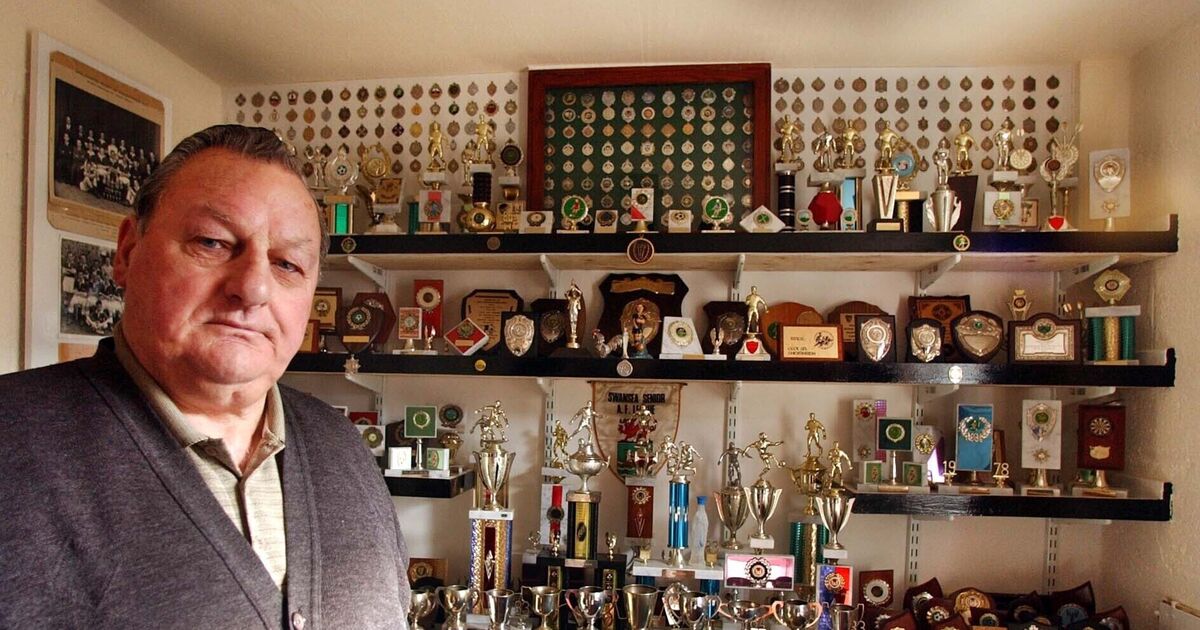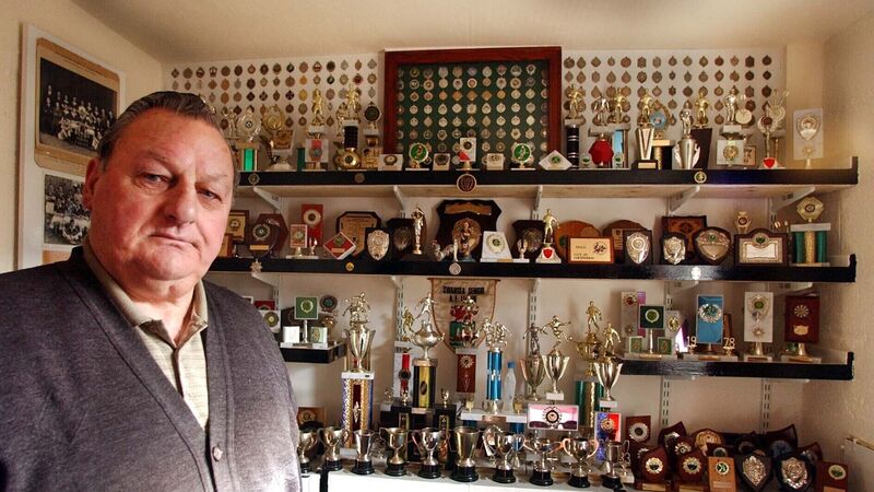 Former soccer star John Coughlan with his trophies at his home in Ballincollig in 2004. Picture: Eddie O'Hare